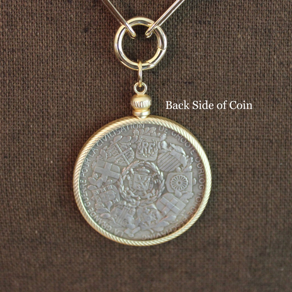 This pendant is inspired by the Allied Victory Medal of World War I. On the back, the words appear in French and Dutch: “La Grande Guerre pour la Civilisation” - “De Groote Oorlog tot de Beschaving.” Both translate to: “The Great War for Civilization.”
