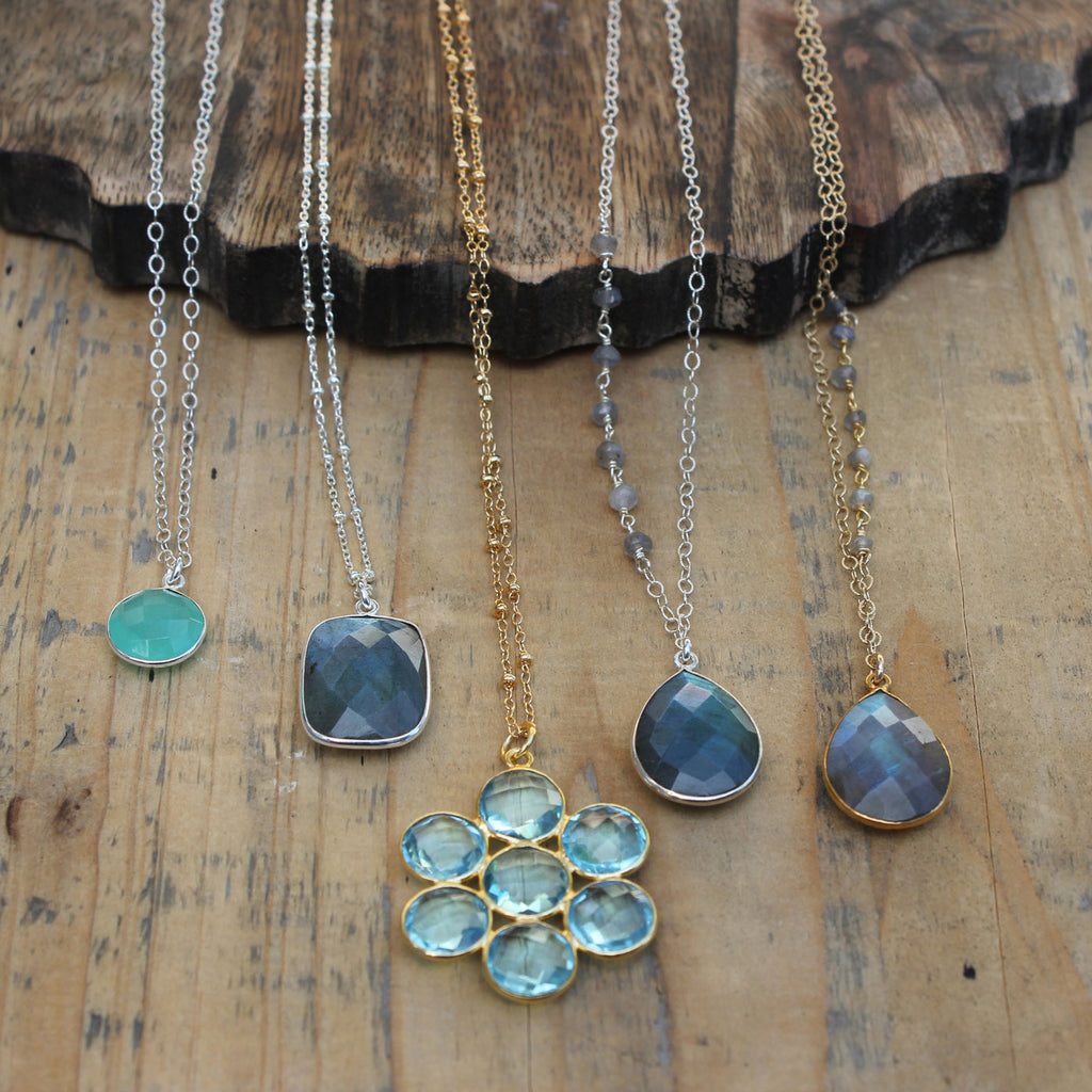 Make a statement or add a touch of elegance to your outfit - the Blue Topaz Flower necklace is a stunning piece, and it complements the Wendy Necklace perfectly.